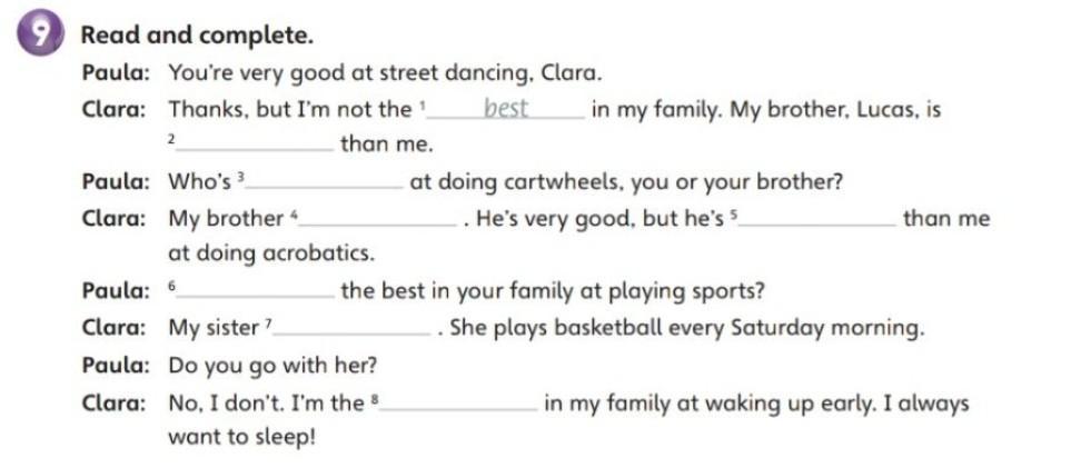read and complete. Paula: You're very good at street dancing Clara. Clara: Thank's but I'm not the ______ in my family. My brother Lukas is____ than me.