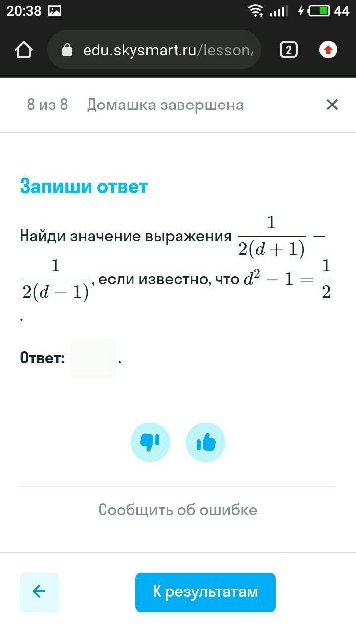 Найдите значение выражения 1/2(d+1) - 1/2(d-1) , если известно , что d²-1=1/2