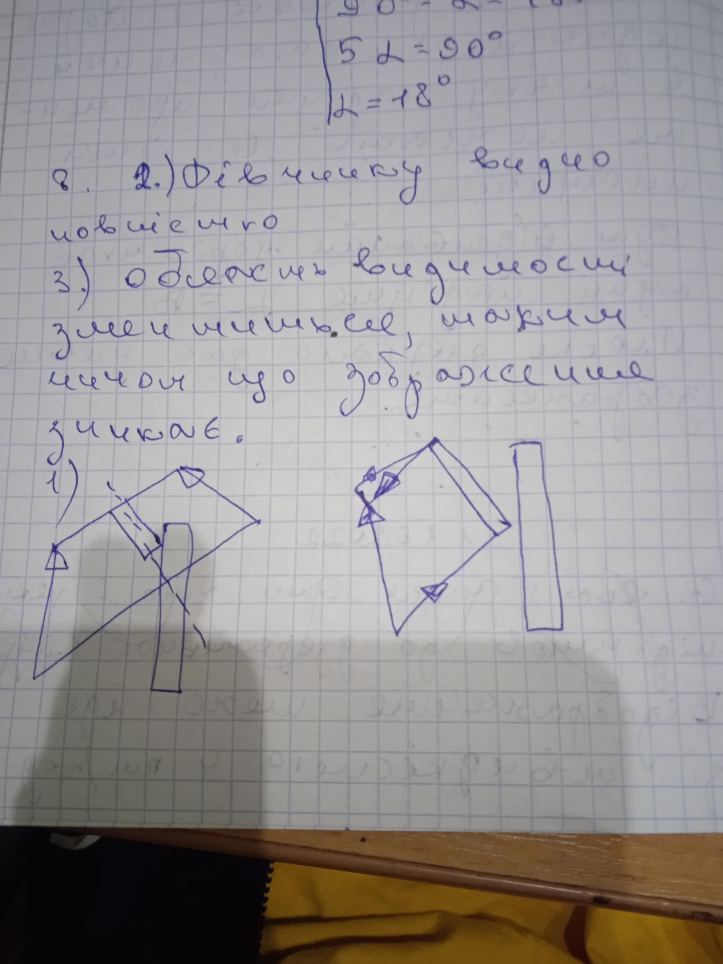 8. Дівчинка дивиться у дзеркало, що висить на стіні під невеликим кутом (рис. 2). 1) Побудуйте зображення дівчинки у дзеркалі. 2) Знайдіть графічно, яку частину свого тіла бачить дівчинка; область, із якої дівчинку видно повністю. 3) Які спостерігатимуться зміни, якщо дзеркало посту- пово затуляти непрозорим екраном?