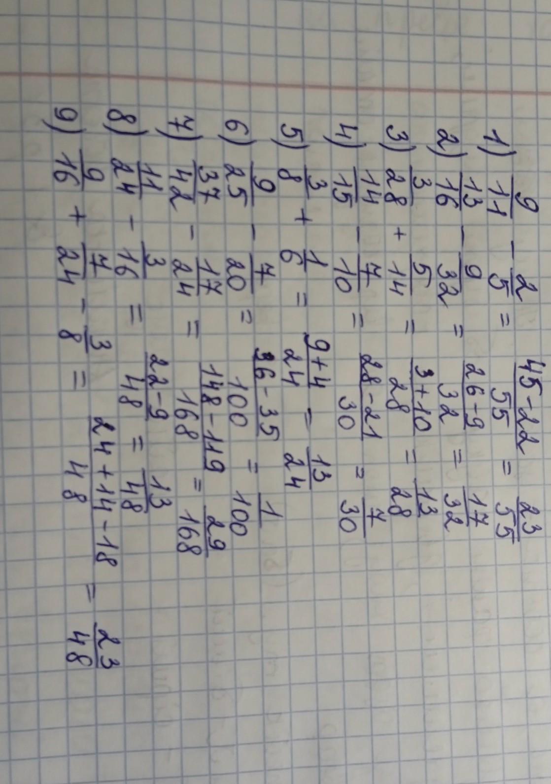 9) 9/16 + 7/24 - 3/8 = 27/48 + 14/48 - 18/48 = (27+14-18)/48 = 23/48