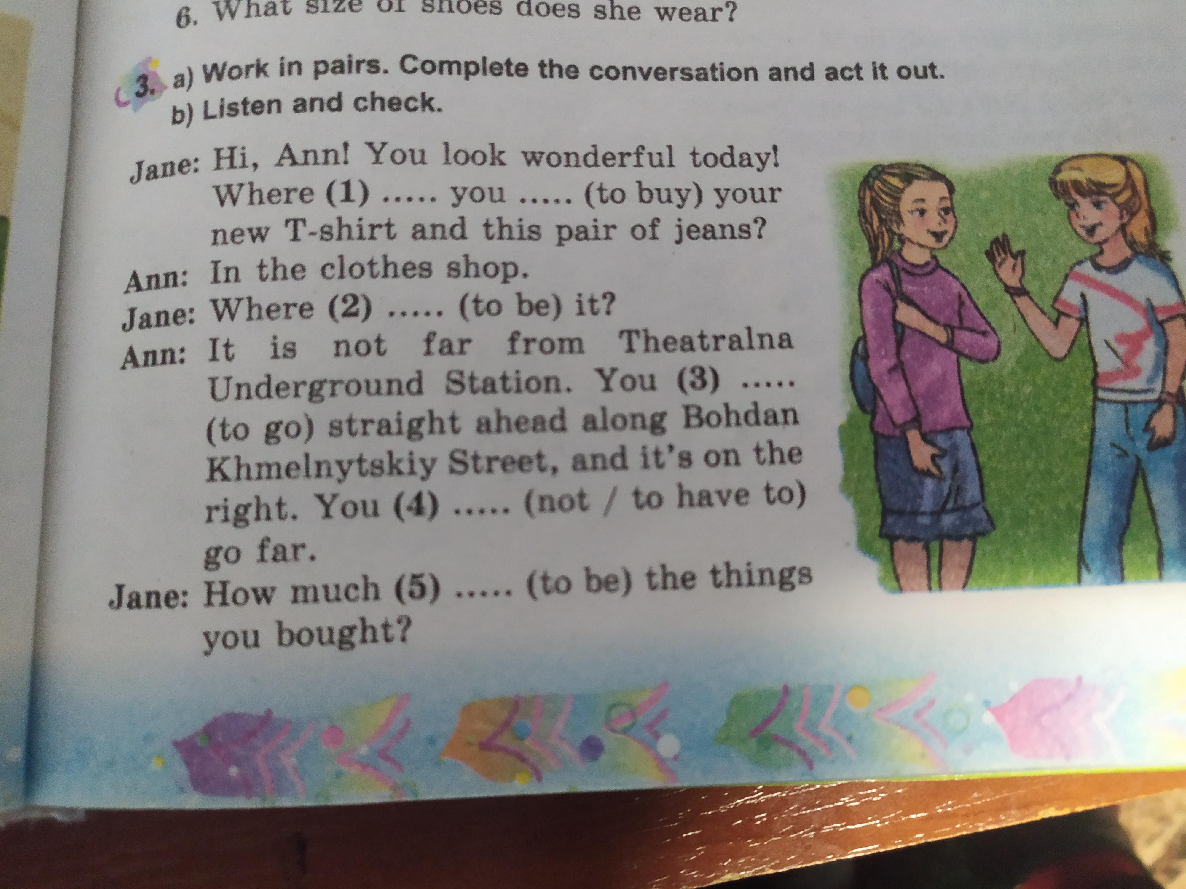 Ответ:Jane : Hi , Ann ! You look wonderful today ! Where (1) have you bought your new T-shirts and this pair of jeans ? Ann: In the clothes shop .Jane: Where (2) is it ?Ann: It is not far from Theatralna Underground Station. You (3) should go straight ahead along Bohdan Khmelnytskiy Street , and it's one the right . You (4) don't have to go far . Jane : How much (5) are the things you bought ?Ann : I don't remember exact price of the T-shirt , but the jeans (6) are 350 UAN . The style is more important for me than the price . And the price is quite important for my mum . She usually ( 7 ) plays for the purchase .