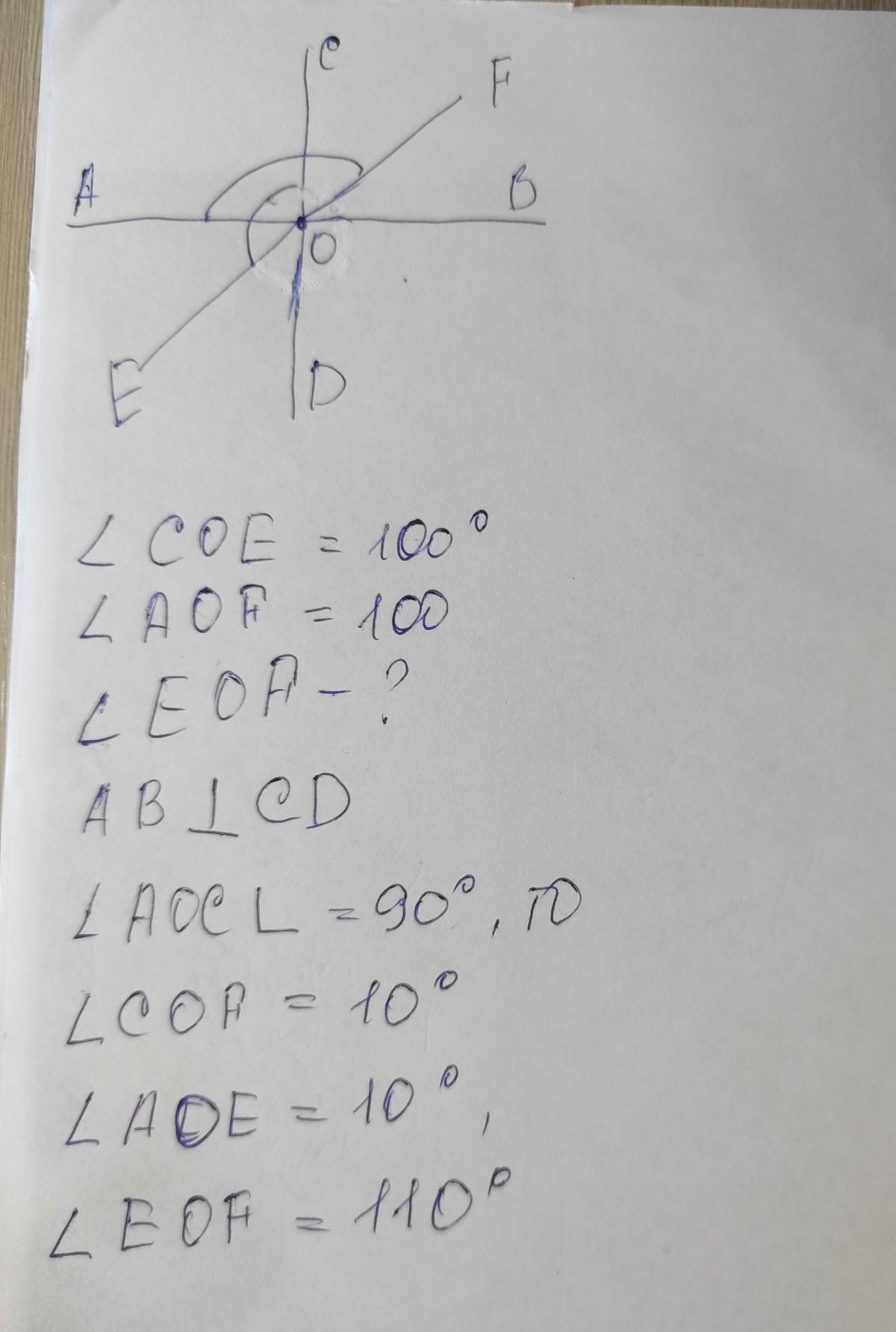 4. Прямі АВ і CD є перпендикулярними й перетинаються в точці О. Промінь ОЕ проходить між променями ОА і OD, а промінь OF проходить між променями OB і OC, LCOE=100 LAOF =100 Знайдіть кут EOF.