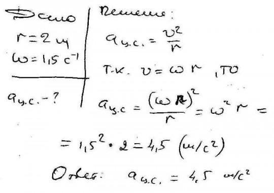 Визначте доцентрове прискорення з яким рухаються крайні точки карусельного станка, віддалені від осі обертання на 2м якщо кутова швидкість обертання становить 1,5рад/с