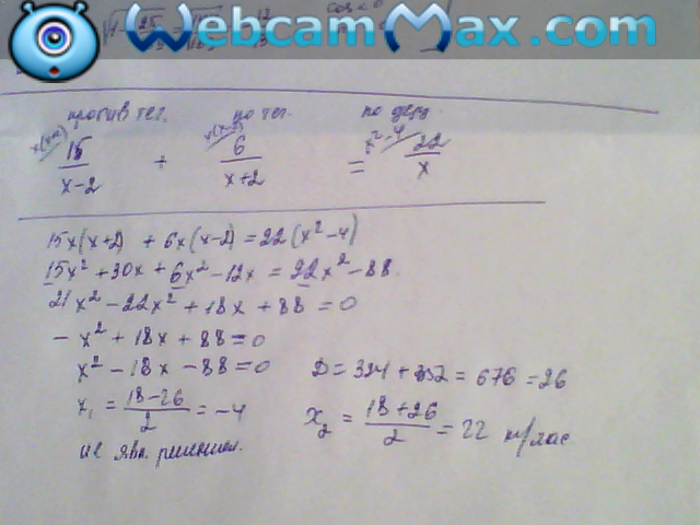 Кратер пролёл 15 км против течения и 6 км по течению затратив на весь путь столько же времени,скалько ему потребовалось бы , если бы он шёл 22 км по озеру.Какова собственная скорость катера ,если известно, что скорость течения реки равна 2 км/ч