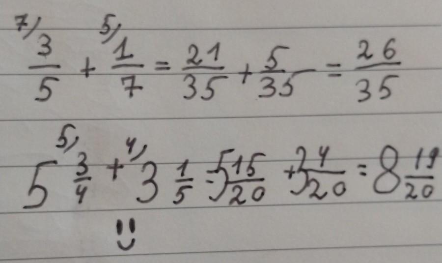 3/5 + 1/7 = 3*7/5*7 + 1*5/7*5 = 21/35 + 5/35 = 26/35