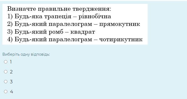 Визначте правильне твердження: 1) Будь-яка трапеція - рівнобічна 2) Будь-який паралелограм - прямокутник 3) Будь-який ромб - квадрат 4) Будь-який паралелограм-чотирикутник