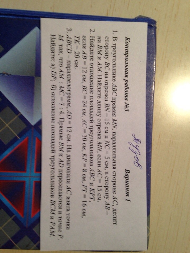 треугольник АВС, МН параллельно АС, ВН=15, НС=5, АС=15, треугольник АВС подобен треугольнику МВН по двум равным углам (уголВ-общий, уголА=уголВМН как соответственные), ВС=ВН+НС=15+5=20, ВН/ВС=МН/АС, 15/20=МН/15, МН=15*15/20=11,25 №2 треугольник АВС подобен треугольнику КРТ по третьему признаку - стороны одного треугольника пропорцианальны сторонам другого треугольника, КР/АВ=8/12=2/3, РТ/ВС=16/24=2/3, КТ/АС=20/30=2/3, отношения сторон равны треугольники подобны, в подобных треугольниках площади относятся как квадрат отношения сторон, площадь КРТ/площадь АВС=(КР/АВ) в квадрате=(2/3)в квадрате=4/9 №3 параллелограммАВСД, АД=ВС=12, АМ/МС=7/4, треугольник ВМС подобен треугольнику АМР по двум равным углам (уголВМС=уголАМР как вертикальные, угол АРМ=уголМВС как внутренние разносторонние), МС/АМ=ВС/АР, 4/7=12/АР, АР=7*12/4=21, ДР=АР-АД=21-12=9, площадьВСМ/площадь РАМ=(МС/АМ) в квадрате=(4/7) в квадрате=16/49