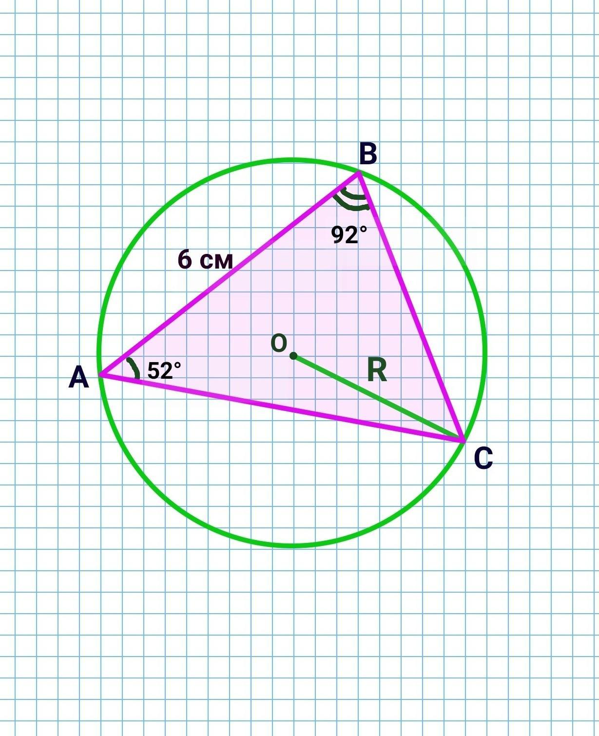 Допоможіть будьласка!!!сторона трикутника дорівнює 6 см, а прилеглі до неі кути доріанюють 52° і 98°. знайти радіус кола описаного навколо цього трикутника