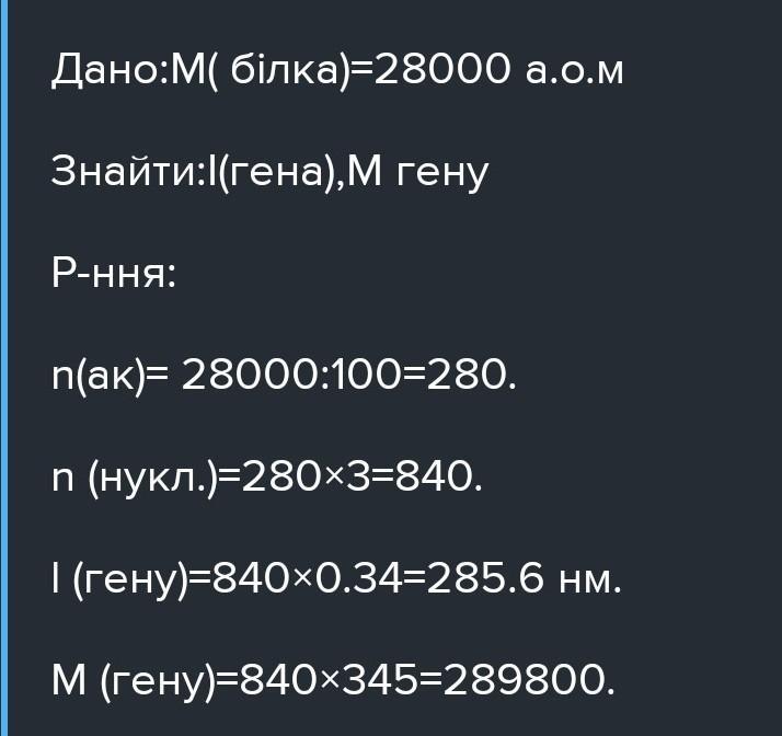 Визначте відносну молекулярну масу й довжину гена, який кодує білок з відносною молекулярною масою 280 000.