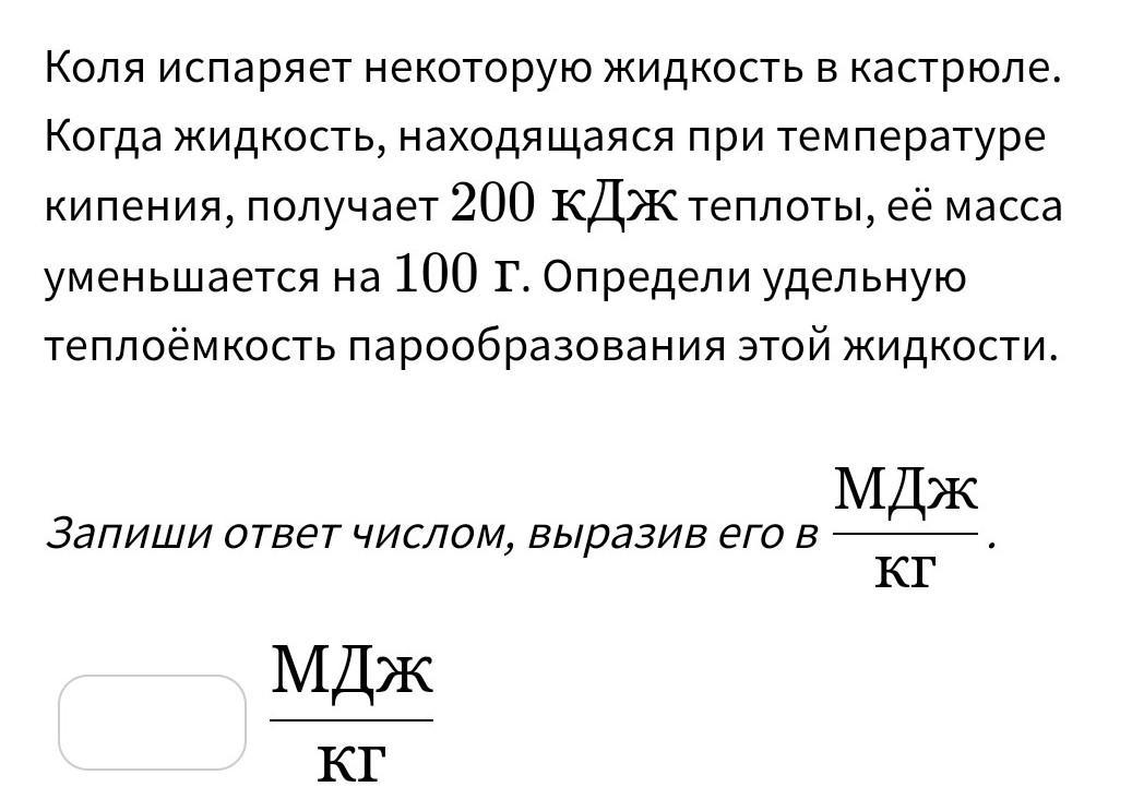 200 кДж это 200000 Дж, 100 грамм - это 0,1 кг. чтоб посчитать удельную теплоемкость, надо количество теплоты поделить на массу. Делим 200000 на 0,1, получаем 2000000. Ответ нужен к МДж. Чтоб перевести в МДж, надо поделить на 1000000. Таким образом, получаем 2 МДж/кг