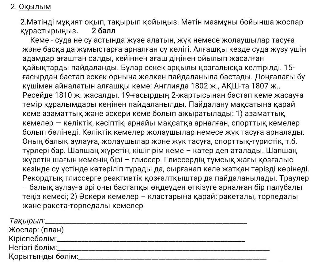 2. Оқылым 2.Мәтінді мұқият оқып, тақырып қойыңыз. Мәтін мазмұны бойынша жоспар құрастырыңыз. 2 балл