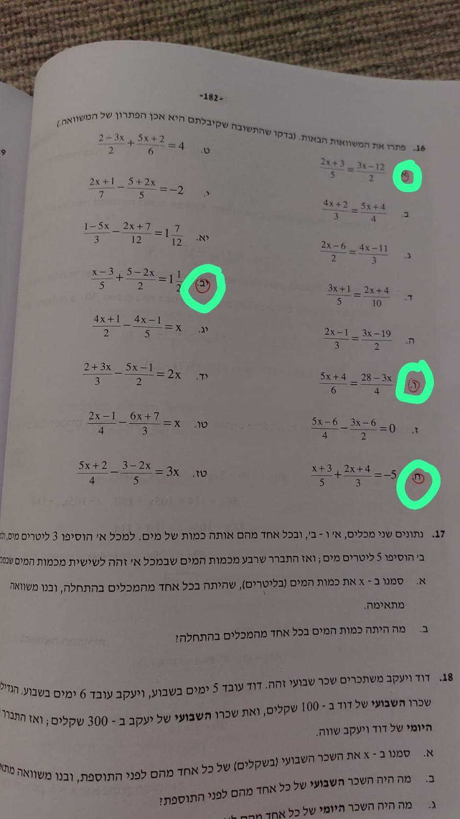 \dfrac{x-3}{5}+\dfrac{5-2x}{2}=1\dfrac{1}{2}\\\\2x-6+25-10x=15\\-8x+19=15\\-8x=-4\\x=\dfrac{1}{2}\\\\\\\dfrac{2x-3}{5}=\dfrac{3x-12}{2}\\4x-6=15x-60\\-9x=-54\\x=6\\\\\\\dfrac{5x+4}{6}=\dfrac{28-3x}{4}\\\\10x+8=84-9x\\19x=76\\x=4\\\\\\\dfrac{x+3}{5}+\dfrac{2x+4}{3}=-5\\\\3x+9+10x+20=-5\\13x+29=-5\\13x=-34\\x=-2\dfrac{8}{13}