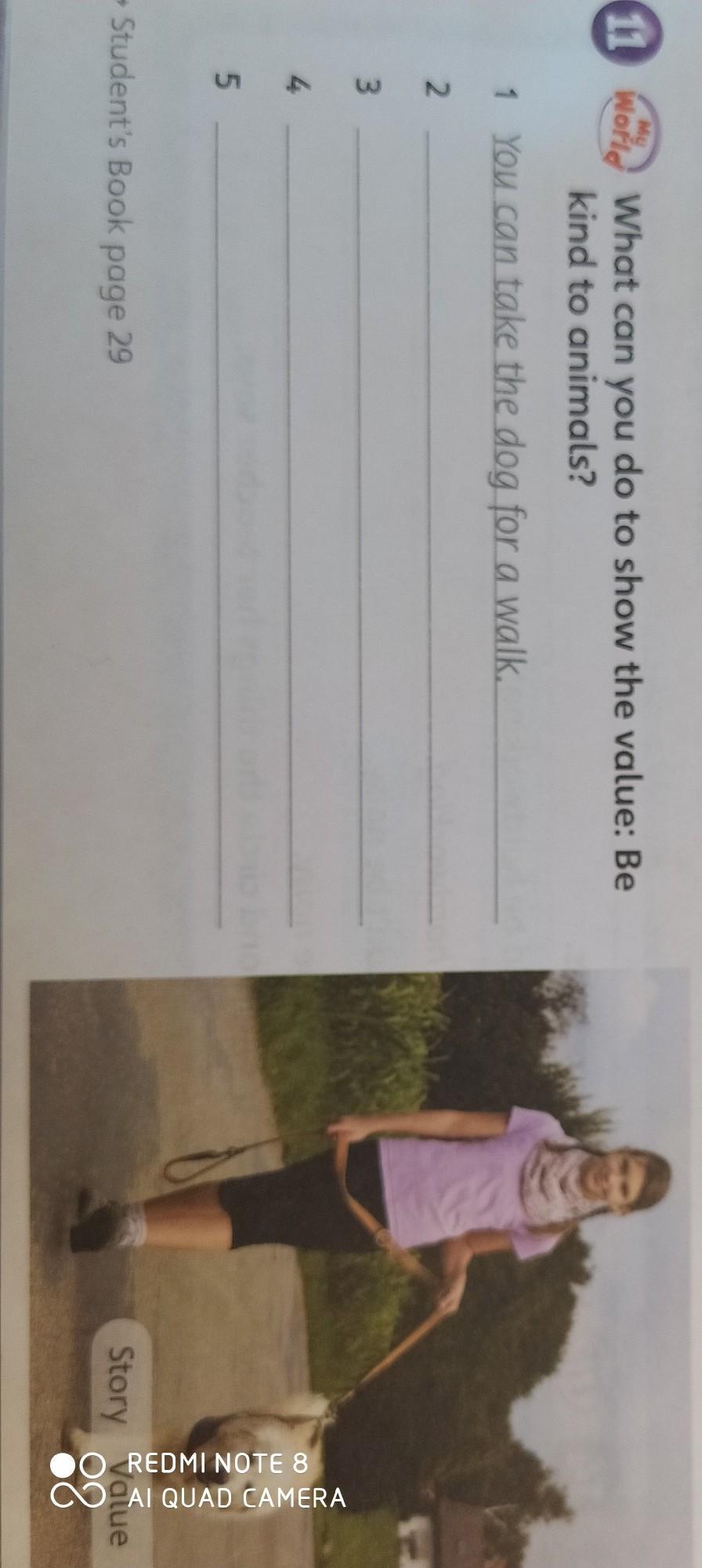 11 World 1 You can take the dog for a walk. What can you do to show the value: Be kind to animals? 5 Student's Book page 29
