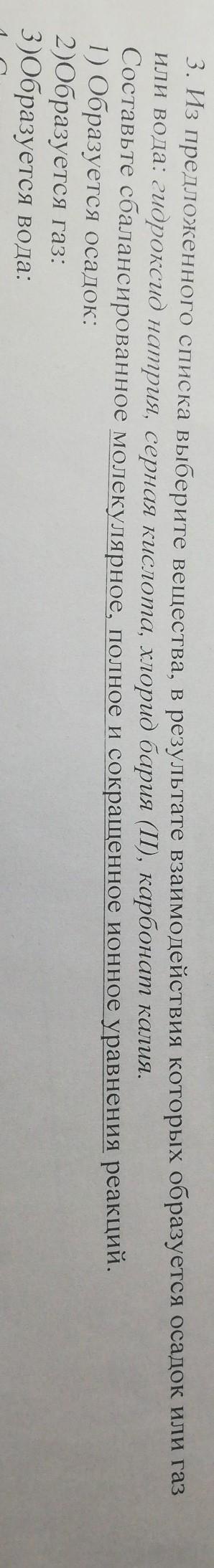 пожалуйста 3. Из предложенного списка выберите вещества, в результате взаимодействия которых образуется осадок или газ или вода: гидроксид натрия, серная кислота, хлорид бария (II), карбонат калия. Составьте сбалансированное молекулярное, полное и сокращенное ионное уравнения реакций. 1) Образуется осадок: 2)Образуется газ: 3)Образуется вода: