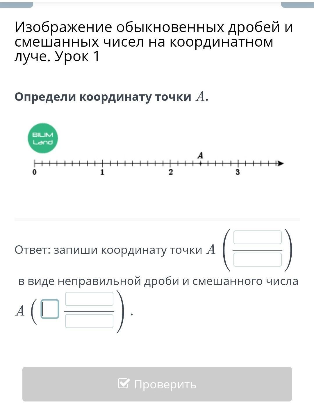 Изображение обыкновенных дробей и смешанных чисел на координатном луче. Урок 1 Определи координату точки А. Ответ: запиши координату точки А в виде неправильной дроби и смешанного числа A