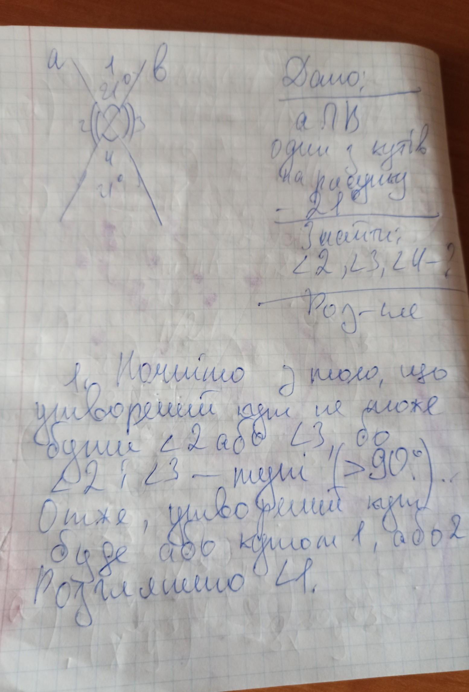 Один iз кутів, які утворилися при перетині двох прямих, дорівнює 21°. Знайдіть iншi кути. СРОЧНООО!!!!!!!