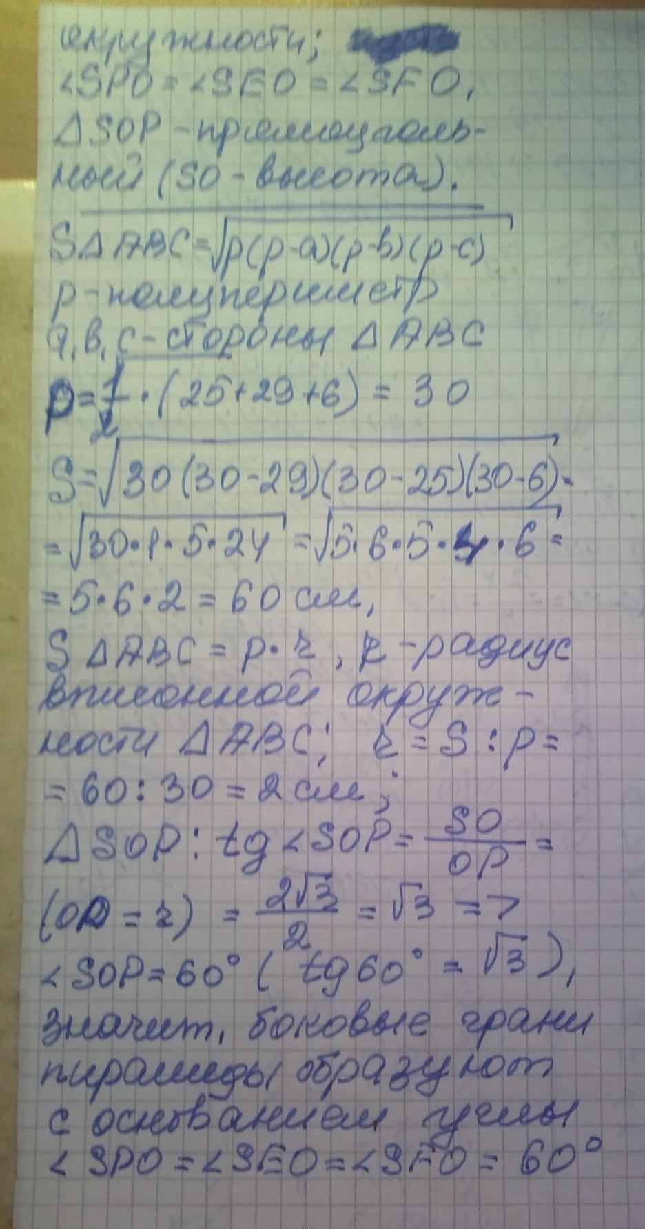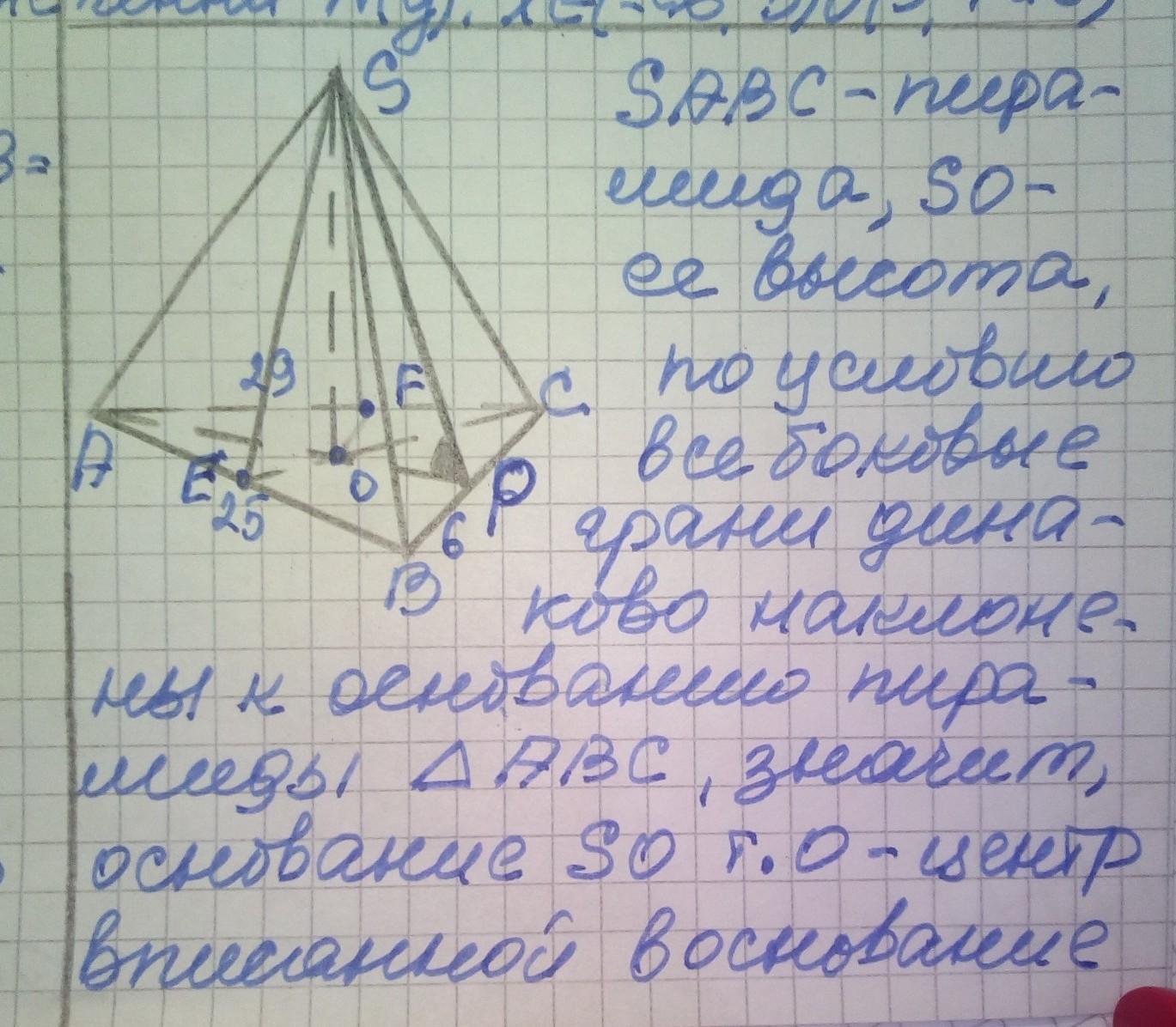 Основой пирамиды есть треугольник со сторонами 6 см, 25 см и 29 см.