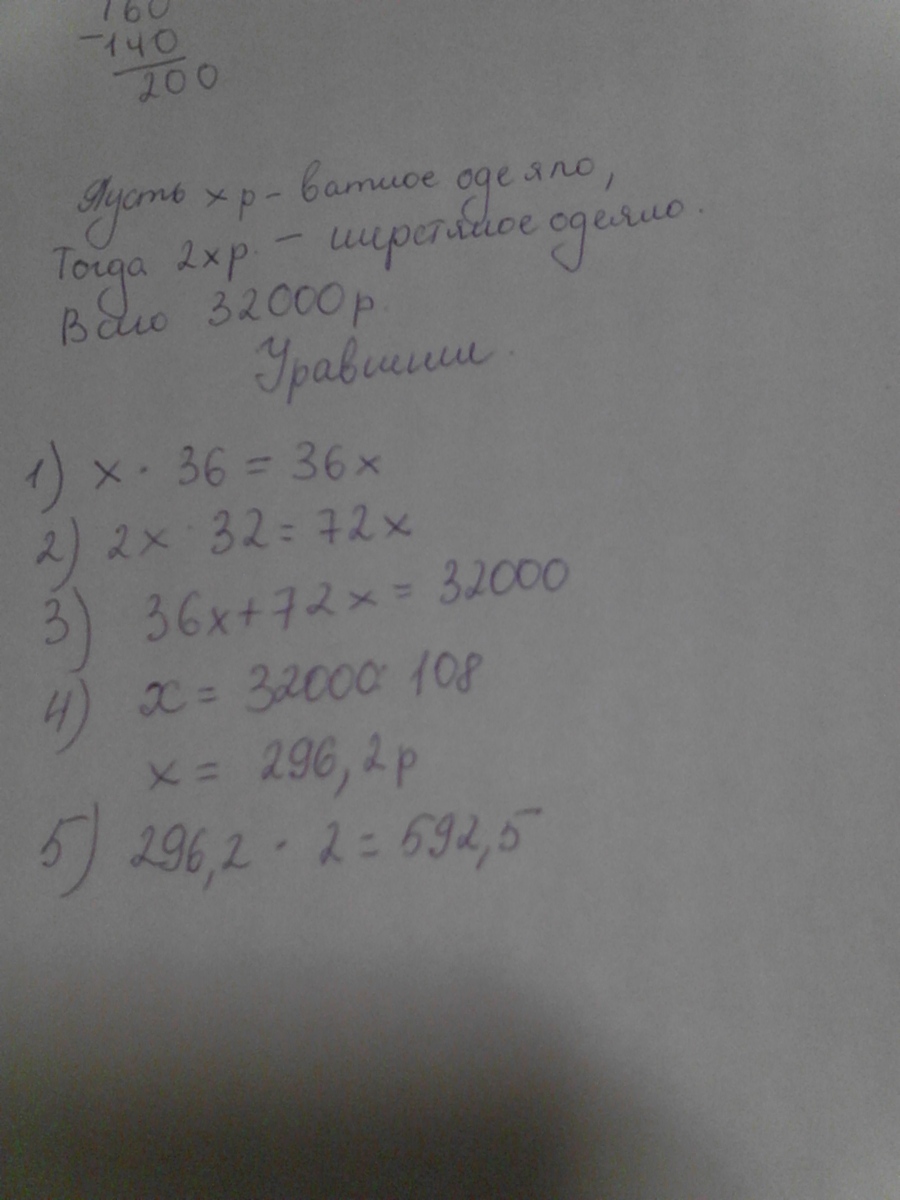 НУЖНО РЕШИТЬ В ДЕЙСТВИЯХ ! Для гостиницы закупили 36 ватных и 32 шерстяных одеяла,причем за всю покупку заплатили 32000 руб.Сколько стоит одно ватное и одно шерстяное одеяло,если шерстяное дороже ватного в 2 раза? РЕШИТЬ ДЕЙСТВИЯМИ А НЕ УРАВНЕНИЕМ!