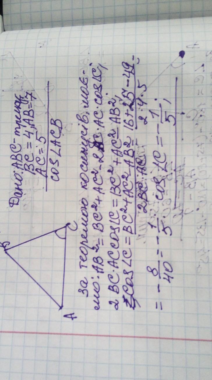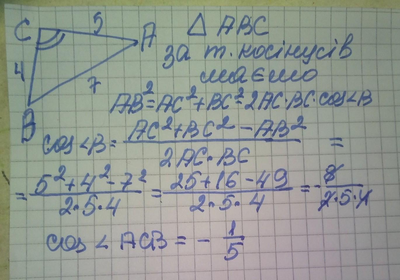 У трикутнику АВС відомо, що ВС=4, АВ=7, АС=5 . Знайдіть косинус кута АСВ.