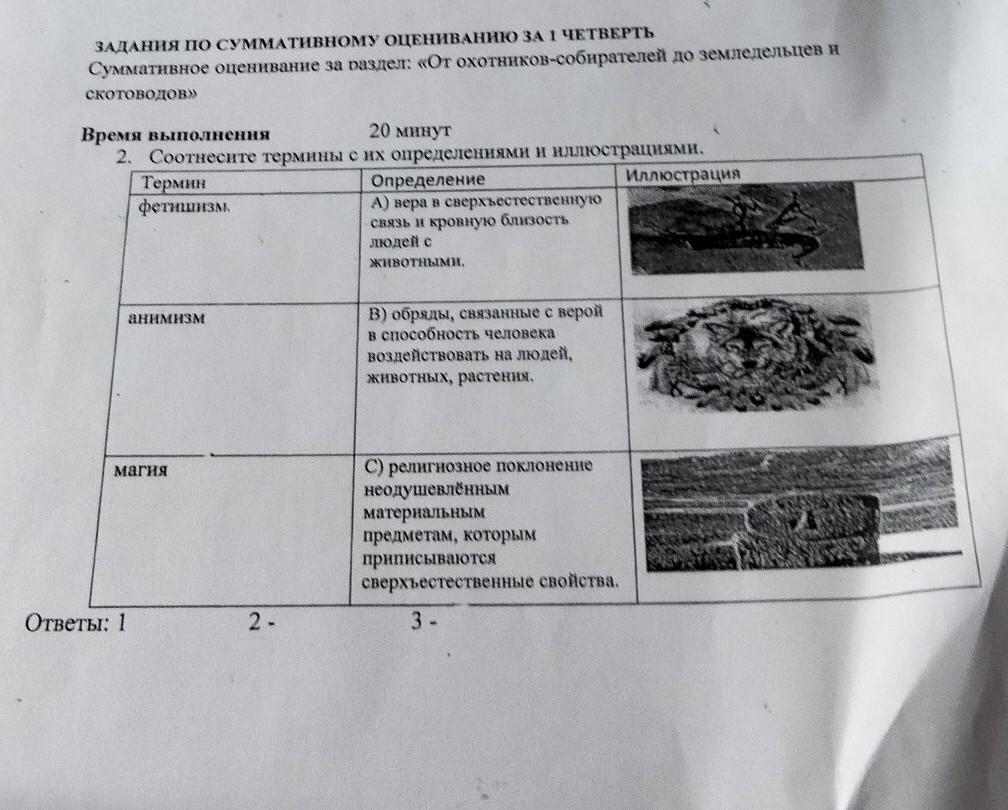 ЗАДАНИЯ ПО СУММАТИВНОМУ ОЦЕНИВАНИЮ ЗА 1 ЧЕТВЕРТЬ Суммативное оценивание за раздел: «От охотников-собирателей до земледельцев и скотоводов» Время выполнения 20 минут 2. Соотнесите термины с их определениями и иллюстрациями. Термин фетишизм анимизм магия Ответы: 1 2- Определение A) вера в сверхъестественную связь и кровную близость людей с животными. В) обряды, связанные с верой в способность человека воздействовать на людей, животных, растения. С) религиозное поклонение неодушевлённым Иллюстрация материальным предметам, которым приписываются сверхъестественные свойства. 3-