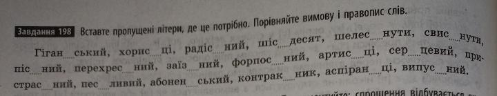 Гiган..ський, хорис..ці, радіс..ний, шіс..десят, шелес..нути, свис..нути, піс..ний, перехрес..ний, заїз..ний, форпос..ний, артис..ці, сер..цевий, пристрас..ний, пес..ливий, абонен..ський, контрак..ник, аспіран..ці, випус..ний.