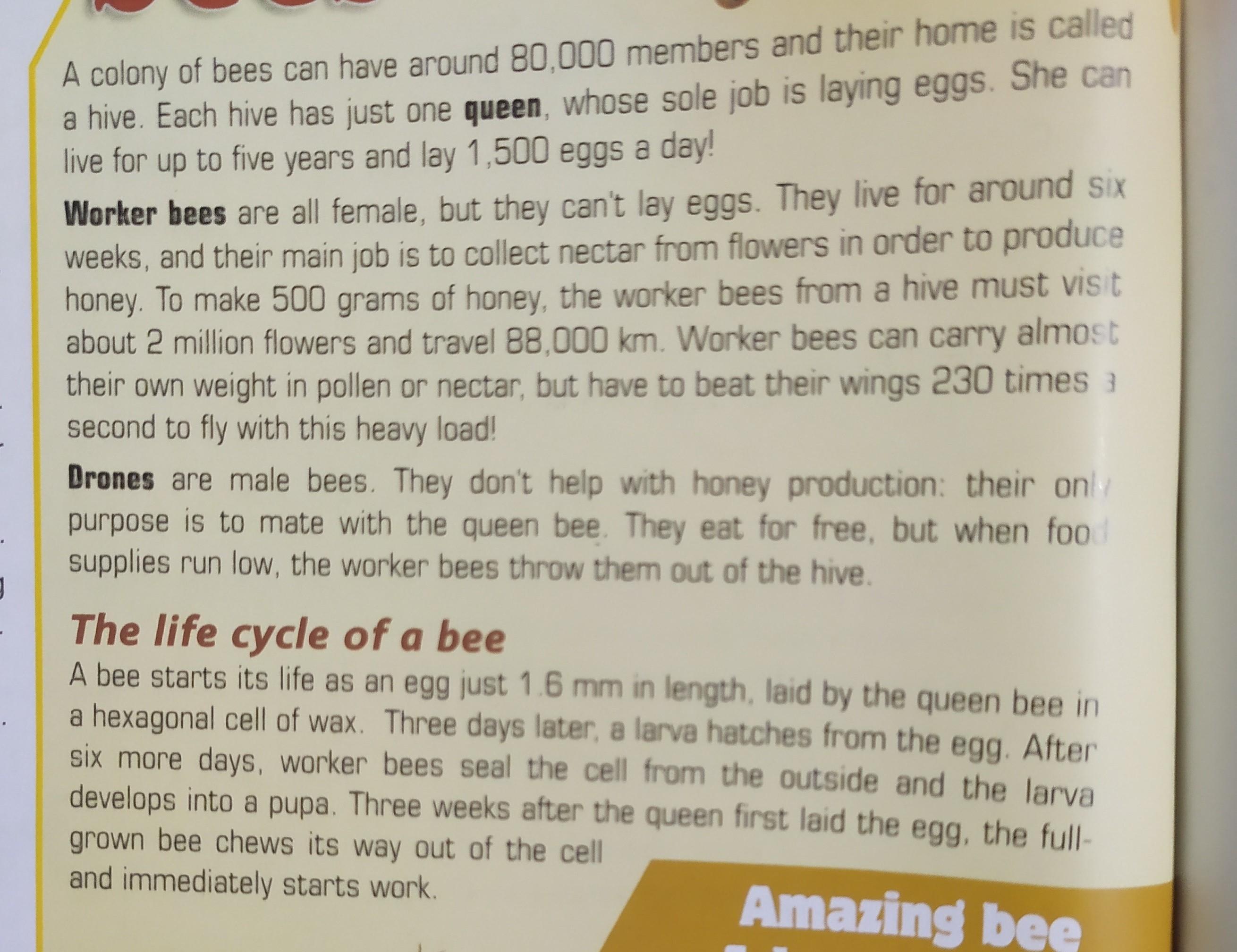 5. It takes three weeks for an egg to grow into the full - grown bee