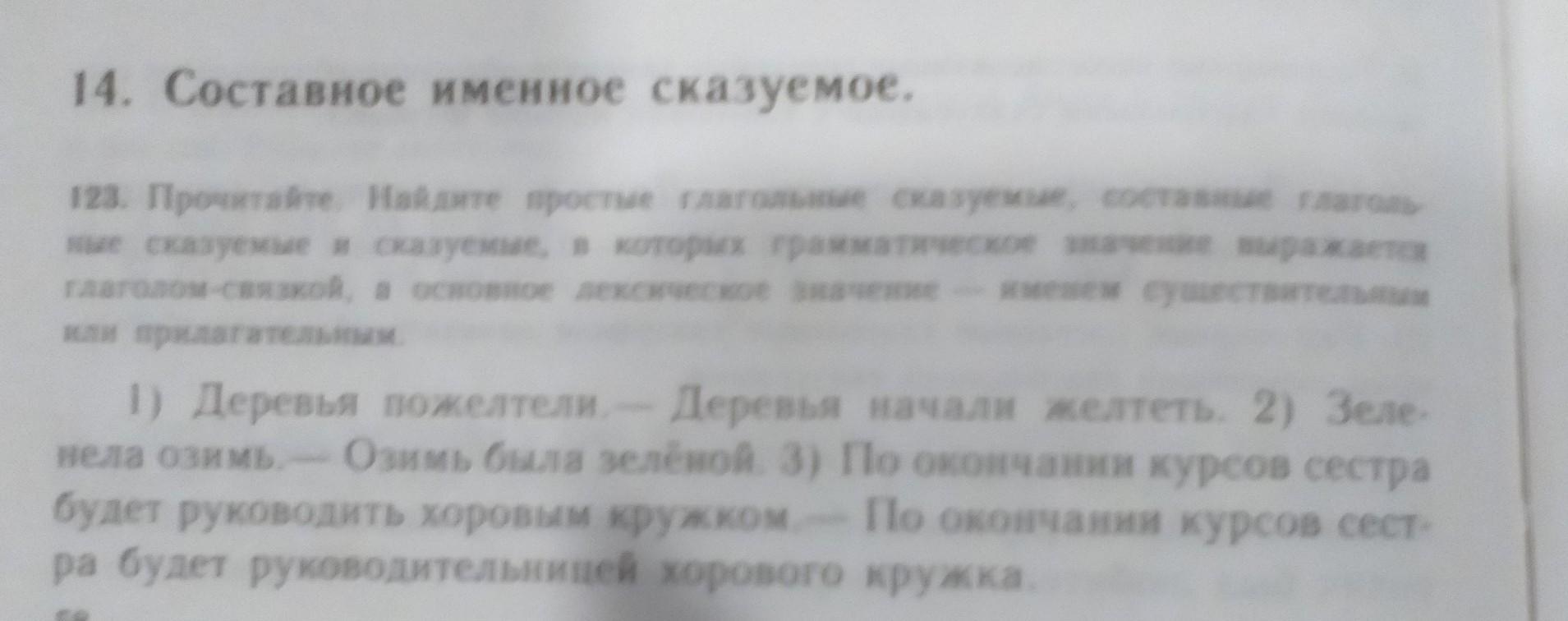 14. Составное именное сказуемое. 123. Прочитайте. Найдите простые глагольные сказуемые, составные глаголь- ные сказуемые и сказуемые, в которых грамматическое значение выражается глаголом-связкой, а основное лексическое значение - именем существительным или прилагательным нела озимь. 1) Деревья пожелтели.- Деревья начали желтеть. 2) Зеле- Озимь была зелёной. 3) По окончании курсов сестра будет руководить хоровым кружком.- По окончании курсов сест- ра будет руководительницей хорового кружка.