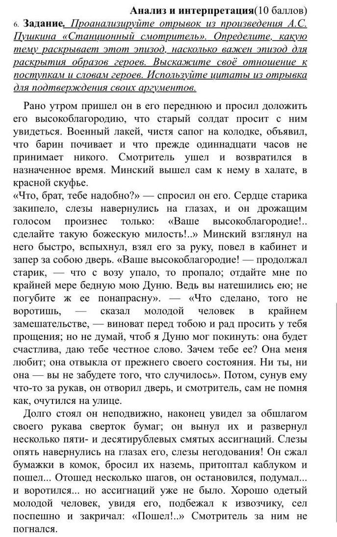 Анализ и интерпретация(10 баллов) 6. Задание. Проанализируйте отрывок из произведения А.С. Пушкина «Станционный смотритель». Определите, какую тему раскрывает этот эпизод, насколько важен эпизод для раскрытия образов героев. Выскажите своё отношение к поступкам и словам героев. Используйте цитаты из отрывка для подтверждения своих аргументов.