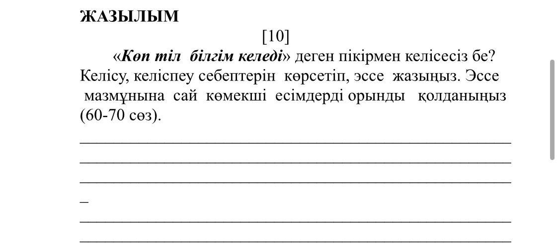 «Көп тіл білгім келеді» деген пікірмен келісесіз бе? Келісу, келіспеу себептерін көрсетіп, эссе жазыңыз. Эссе мазмұнына сай көмекші есімдерді орынды қолданыңыз (60-70 сөз). СРОЧНО