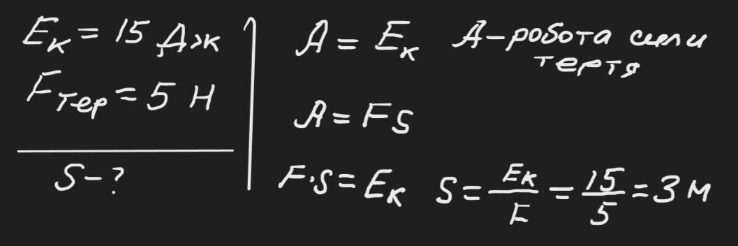 Визначити, на яку відстань відкотиться куля, якшо кінетична енергія на початку руху 15 Дж. а сила тертя під час руху дорівнює 5 Н.