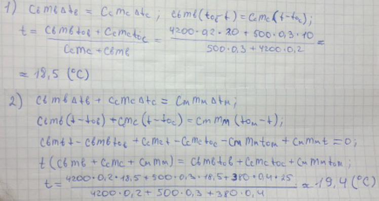 В воду массой 200 г при температуре 20 °С положили кусок горячей стали массой 100 г при температуре 100 °С, как показано на рисунке. Дж кг . °C' Свода = 4200- ; Ссталь = 500 горячая сталь вода Дж кг . °C (а) Напишите уравнение теплового баланса для воды и льда. (b) Определите температуру установившегося теплового равновесия