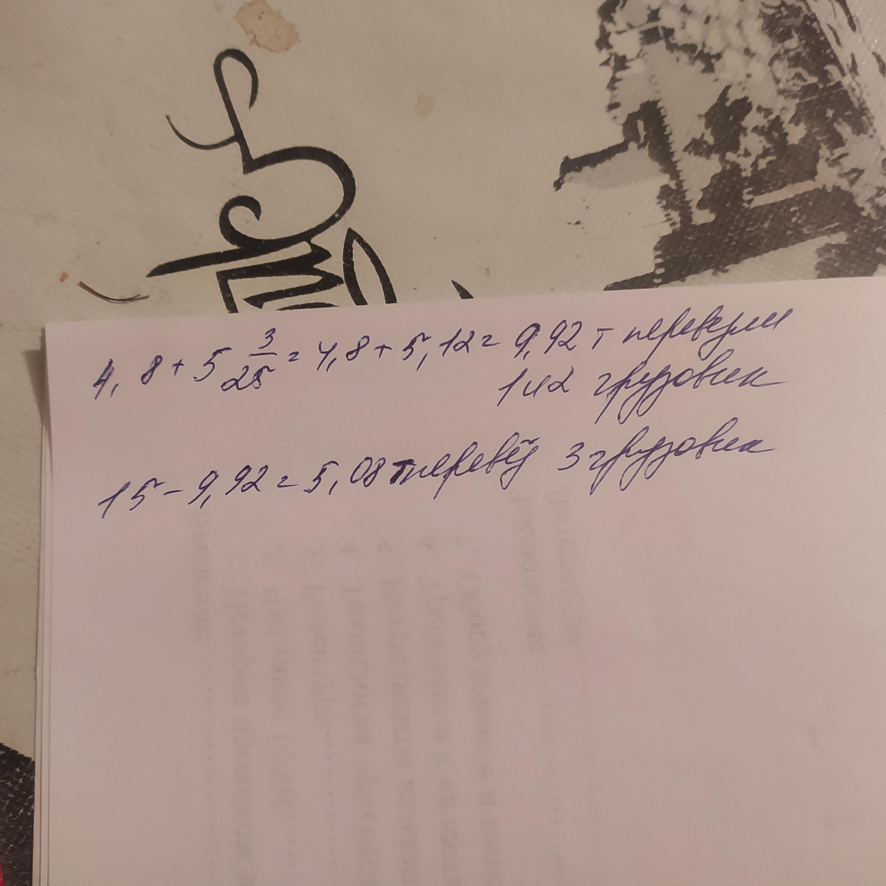 Три вантажники перевезли 15т піску зокрема перша 4,8 т а друга 5 3/25 т скільки тонн піску перевезла третя