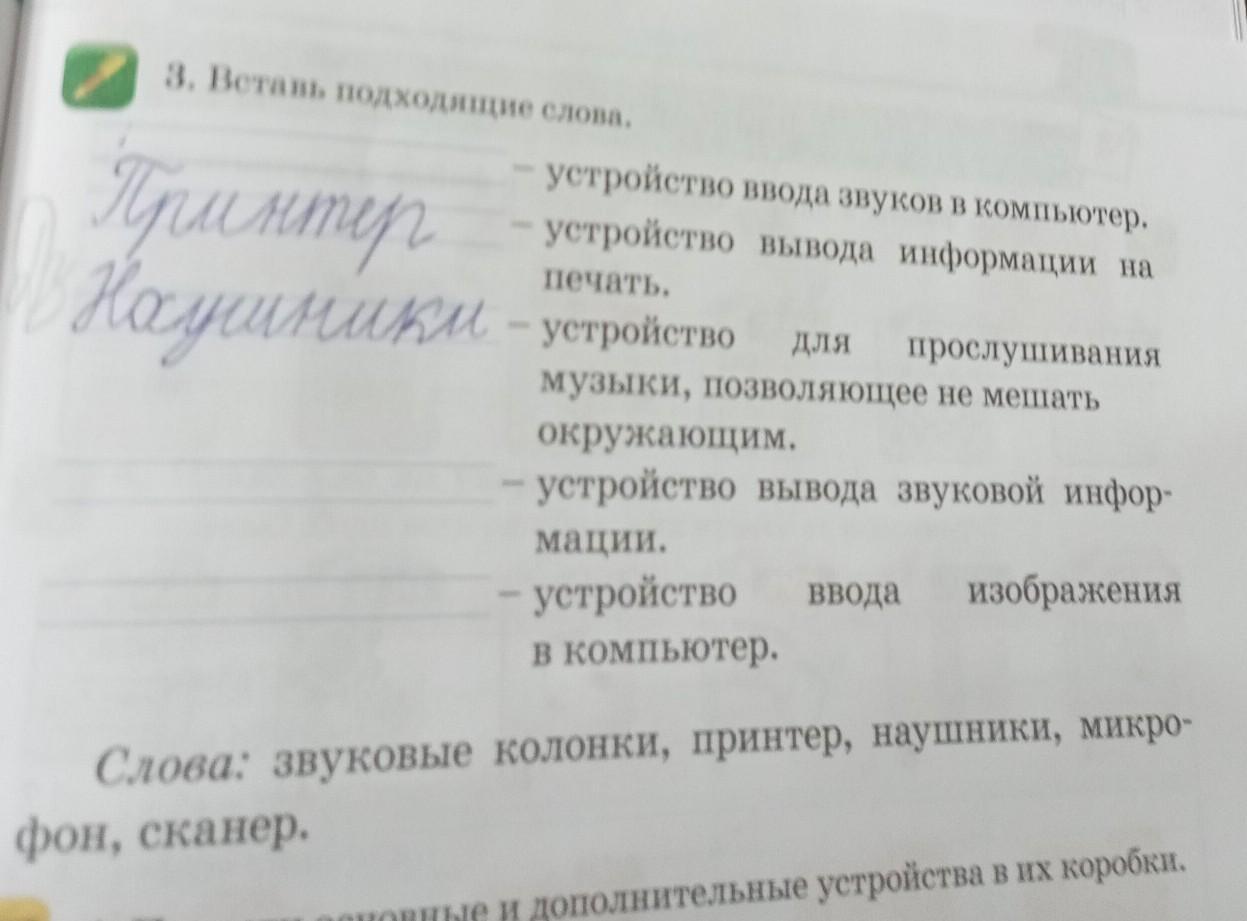 М Урок 27. Рабочий лист 1 3. Вставь подходящие слова. - устройство ввода звуков в компьютер. - устройство вывода информации на печать. - устройство для прослушивания музыки, позволяющее не мешать окружающим. - устройство вывода звуковой инфор- мации. - устройство ввода И3OБPaЖЕНИЯ в компьютер. Слова: звуковые колонки, принтер, наушники, микро- фон, сканер.