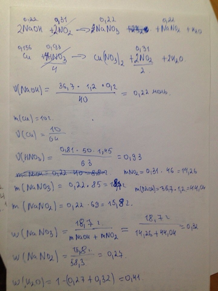 через 36.7 мл раствора с массовой долей гидроксида натрия 20% (р=1,2г/см^3) пропустили газ,полученный при взаимодействии 10г меди с 50мл раствора HNO3 с массовой долей 81%(р=1,45г/см^3).определите массовые доли веществ в полученном растворе..(я не поняла,азотная кислота концентрированная или разбавленная??)