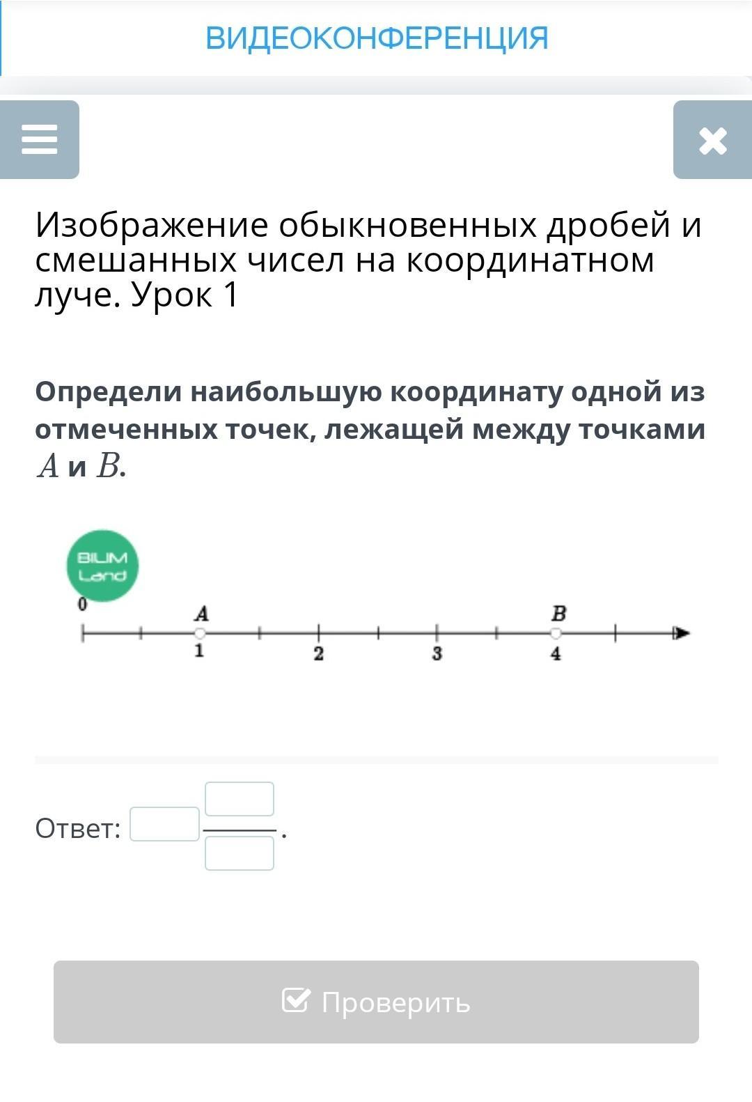 Определи наибольшую координату одной из отмеченных точек, лежащей между точками А и В. BILIM Lend 0 Ответ: A 1 3 со в 4