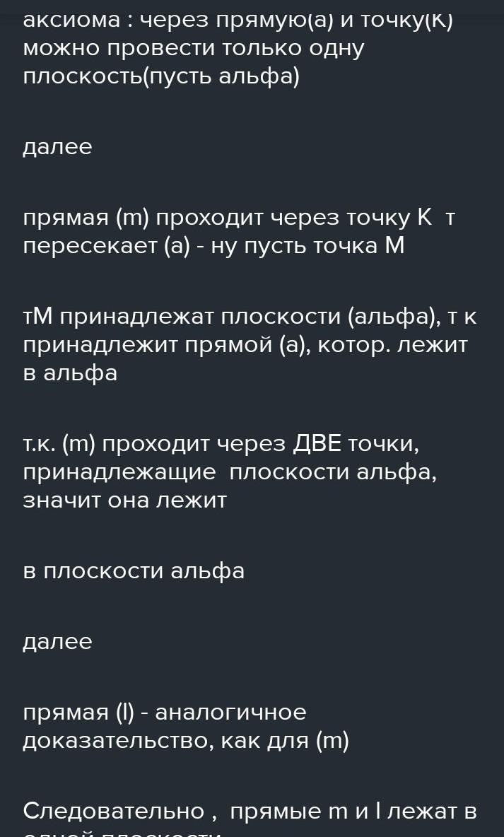 1.Даны прямая а и точка К, которая не лежит на этой прямой. Через точку К проведены прямые m и l, пересекающие прямую а. Докажите, что прямые a, m и l лежат в одной плоскости.