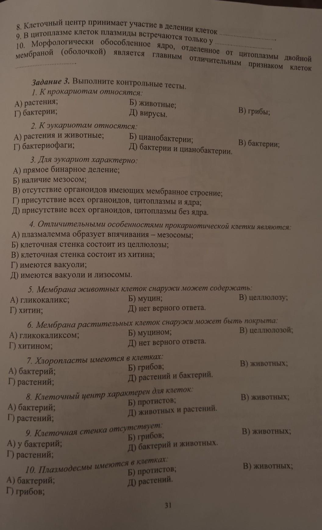 8. Клеточный центр принимает участие в делении клеток. 9. В цитоплазме клеток плазмиды встречаются только у 10. Морфологически обособленное ядро, отделенное от цитоплазмы двой мембраной (оболочкой) является главным отличительным признаком кл Задание 3. Выполните контрольные тесты. 1. К прокариотам относятся: A) растения; г) бактерии; 2. К эукариотам относятся: А) растения и жите г) бактериофаги; 3. Для эукариот характерно: А) прямое бинарное деление; Б) наличие мезосом; в) отсутствие органоидов имеющих мембранное строение; Б) животные; Д) вирусы. Г) присутствие всех органоидов, цитоплазмы и ядра: Д) присутствие всех органоидов, цитоплазмы без ядра. А) гликокаликс; Г) хитин; Б) цианобактерии; Д) бактерии и цианобактерии. 4. Отличительными особенностями прокариотической клетки являются: А) плазмалемма образует впячивания - мезосомы; Б) клеточная стенка состоит из целлюлозы; В) клеточная стенка состоит из хитина; Г) имеются вакуоли; Д) имеются вакуоли и лизосомы. 5. Мембрана животных клеток снаружи может содержать: Б) муцин; Д) нет верного ответа. А) бактерий; Г) растений; 7. Хлоропласты имеются в клетках: Б) грибов; Д) растений и бактерий. А) бактерий; Г) растений, 6. Мембрана растительных клеток снаружи может быть покрыта: А) гликокаликсом; Б) муцином; В) целлюлозой; Г) хитином; Д) нет верного ответа. 8. Клеточный центр характерен для клеток: Б) протистов; А) у бактерий Г) растений; 9. Клеточная стенка отсутствует: Б) грибов; А) бактерий; г) грибов; Д) животных и растений. В) грибы; Д) бактерий и животных. 10. Плазмодесмы имеются в клетках: Б) протистов; Д) pacтeний. В) бактерии; 31 В) целлюлозу; В) животных; В) животных; В) животных; В) животных;