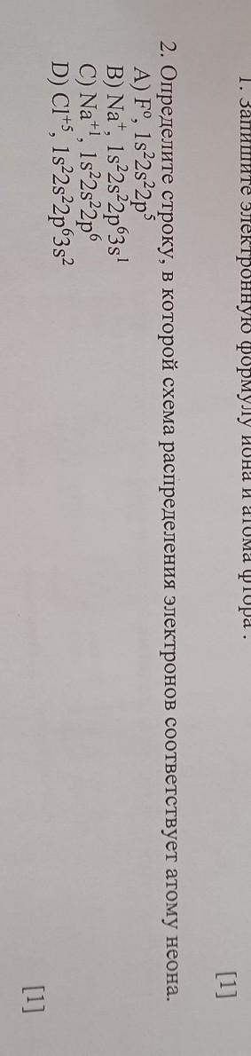 1. Запишите электронную 2. Определите строку, в которой схема распределения электронов соответствует атому неона A) Fº. 1s²2s²2p B) Na. 1s²2s 2p63s C) Na-1. 1s²2s22p6 D) CI S. 1s²2s22p63s2