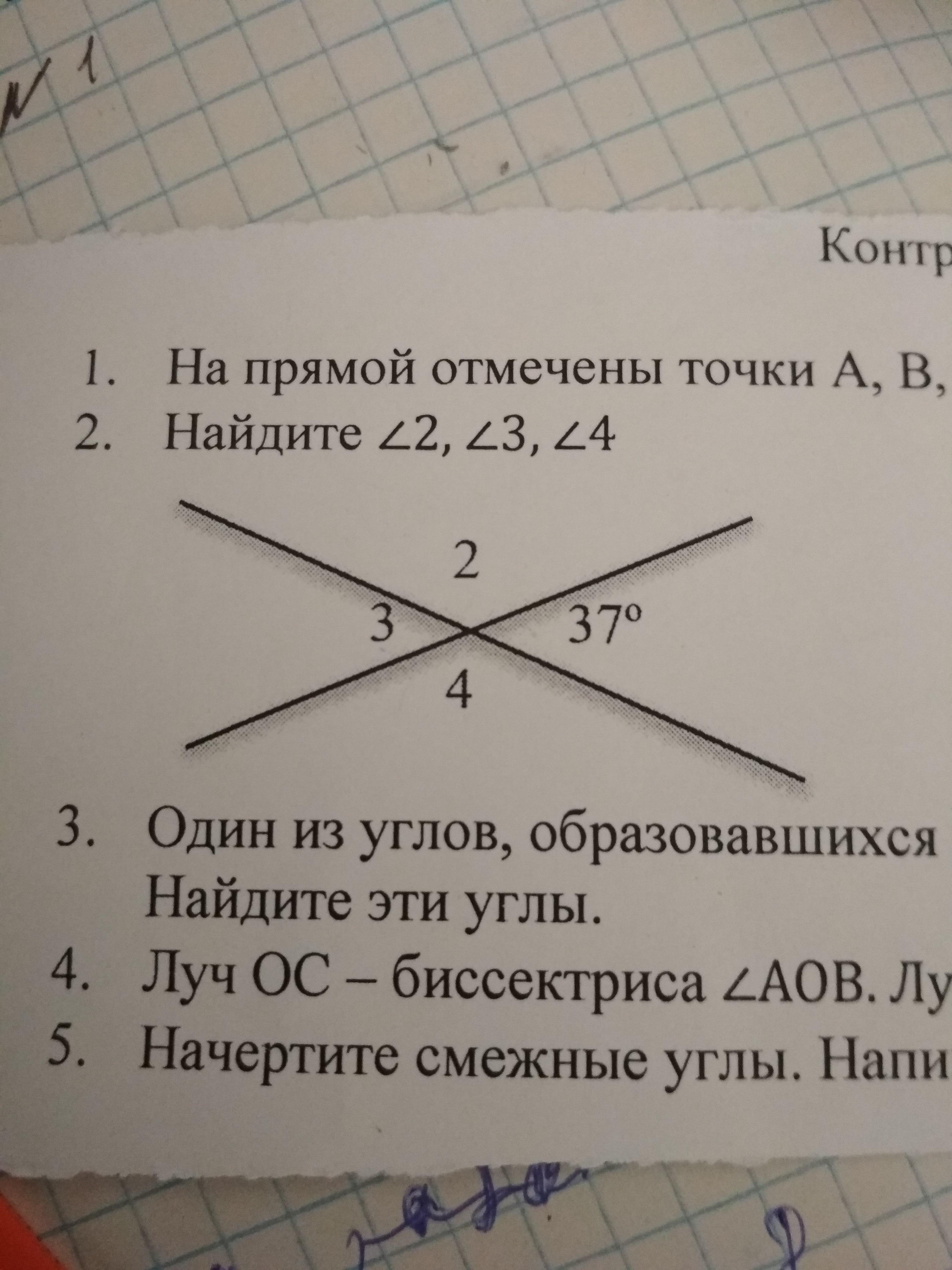 Т.к. a||b. То угол 1 = углу 2 = 37°, как вертикальные, далее угол 2 = углу = 37°, как накрест лежащие. Чтобы найти угол 3, нужно. b = 180°, а угол 2 =37°. Угол 4 = 180° - угол 2 ; 180° - 37° =143