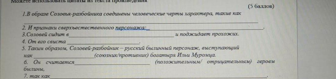 Можете использовать цитаты из текста произведения 1.В образе Соловья-разбойника соединены человеческие черты характера, такие как 2. И признаки сверхъестественного персонажа. 3.Соловей сидит в и поджидает прохожих. 4. От его свиста 5. Таким образом, Соловей-разбойник - русский былинный персонаж, выступающий (союзник/противник) богатыря Ильи Муромца. как 6. Он считается былины, 7. так как (5 баллов) (положительным/ отрицательным) героем пж срочно