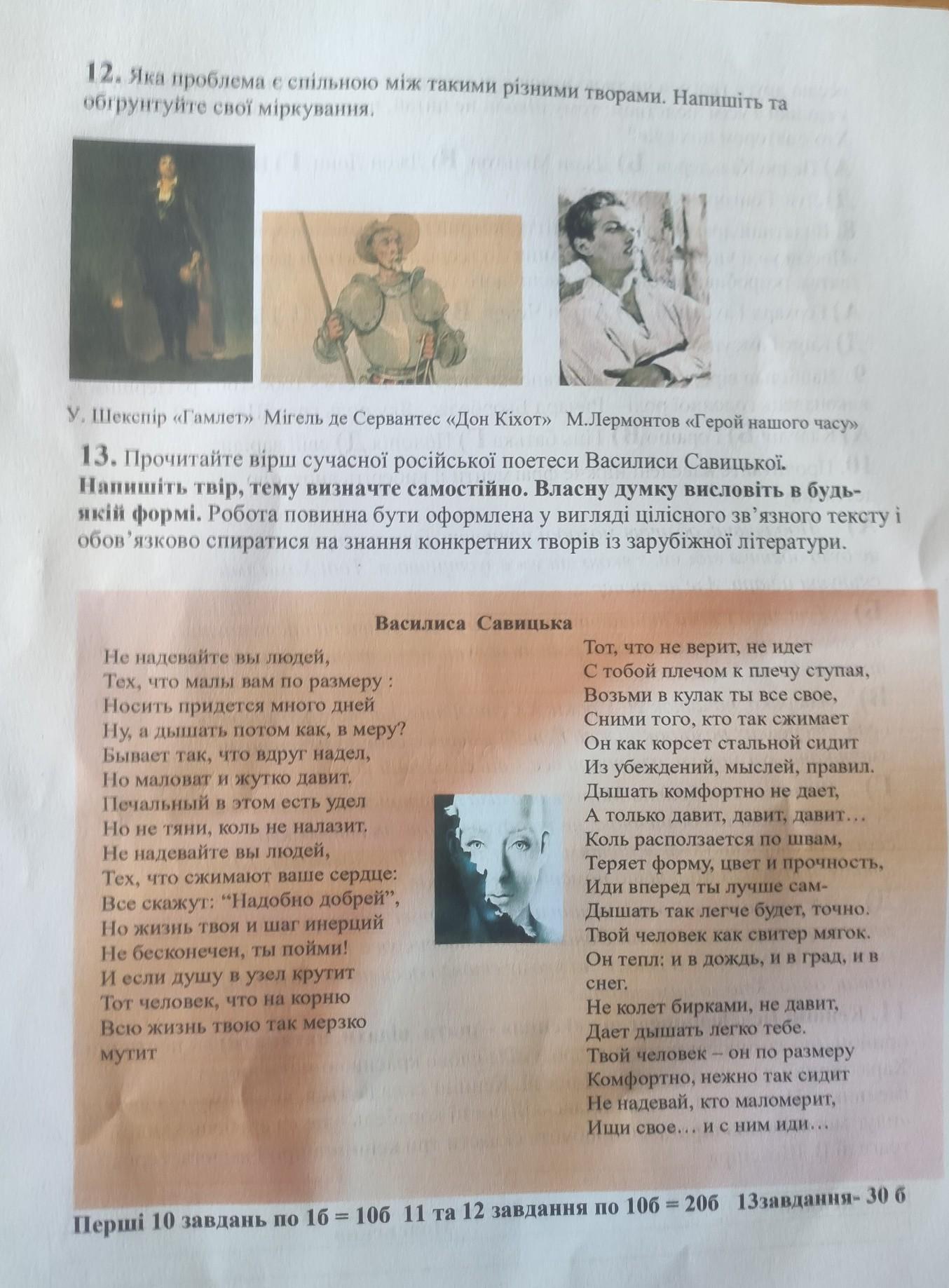 12. Яка проблема є спільною мiж такими різними творами. Напишіть та обгрунтуйте свої міркування. (Я КМ (d MXT ht DIESJ 18 У. Шекспір «Гамлет» Мігель де Сервантес «Дон Кіхот>> М.Лермонтов «Герой нашого часу»