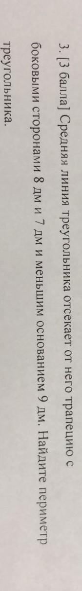 Средняя линия треугольника отсекает от него трапецию с боковыми сторонами 8дм и 7дм и меньшим основанием 9 дм. Найдите периметр треугольника