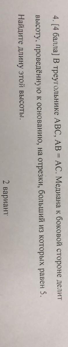 В треугольнике ABC, AB=AC медиана к боковой стороне делит высоту, проведеную к основанию, на отрезки, больший из которой равен 5. Найдите длину этой высоты
