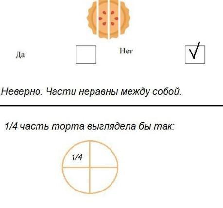 1. Торт разделен на 4 части, как показано на 1 рисунке. Верно ли, что каждая часть равна - части 4 всего торта? [1]