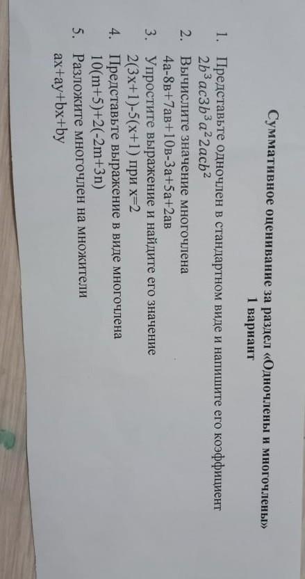 Суммативное оценивание за раздел «Одночлены и многочлены» 1 вариант 1. Представьте одночлен в стандартном виде и напишите его коэффициент 2b3ac3b3a2 2ась 2