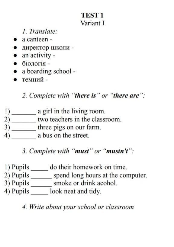 1. a canteen - їдальня, директор школи - headmaster, an activity - діяльність, біологія - biology, a boarding school - школа-інтернат, темний - dark