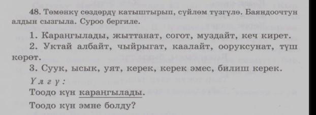 Жыттанат, согот, муздайт, уктай албайт, чыйрыгып, баштайт, каралайт ,ооруксунат , түш көрөт вот эти слова надо почеркнуть двумя прямыми линиями