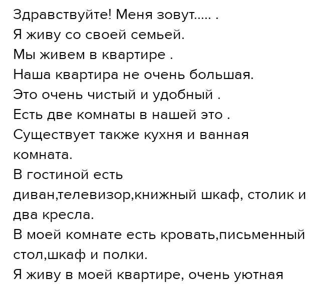 2. Сначала я иду в ванную 3. В 9 часов я иду на работу 4. Я сажусь на автобус, чтобы добраться до метро +5. Я ужинаю в 7 часов со своей семьей Е 6. В четверть одиннадцатого я ложусь спать + Задание 2. Чтение. Прочтите следующее описание раздела »Моя квартира"> и ответьте на вопросы. Моя квартира Мы живем в квартире. Наша квартира не очень большая. Здесь очень чисто и уютно. В нашей квартире две комнаты. Кроме того, в вашем распоряжении кухня и ванная комната. В гостиной есть диван, телевизор. книжный шкаф, журнальный столик и два кресла. В моей комнате есть кровать, письменный стол, шкаф и полка. Я очень люблю свою квартиру. Вопросы: (6 баллов) 1. 2. Грязная ли квартира? В их квартире есть две комнаты - не так ли? 4. Есть ли в квартире кухня? 5. Есть ли телевизор в спальне? Их квартира очень большая? (5 баллов)