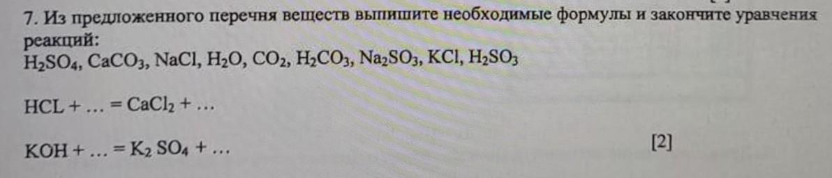 7. Из предложенного перечня веществ выпишите необходимые формулы и закончите уравчения реакций: H2SO4, CaCO3, NaCl, H2O, CO2, Н2СО3, Na2SO3, КСI, H2SO3 HCL + ... = CaCl2 + ... KOH + ... = K2 SO4 + ... 8. Определите тип химической реакции. [2]
