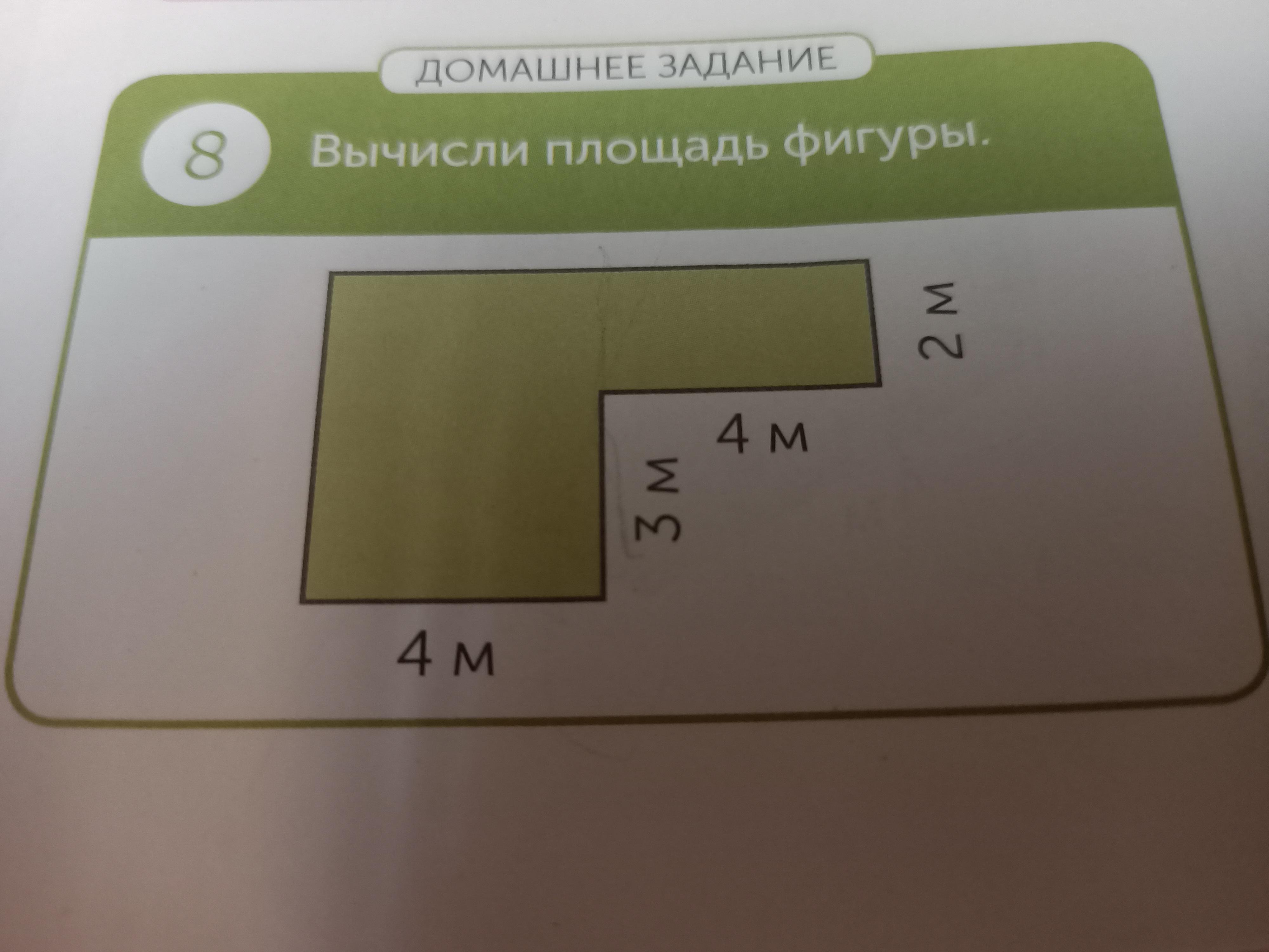 Сначала вычислим площадь квадрата поменьше. Одна его сторона равна 4м, а вторая 3+2=5(м). В итоге площат этой фигуры 4*5=20(м^2). Площадь квадрата поменьше равна 4*2=8(м^2).